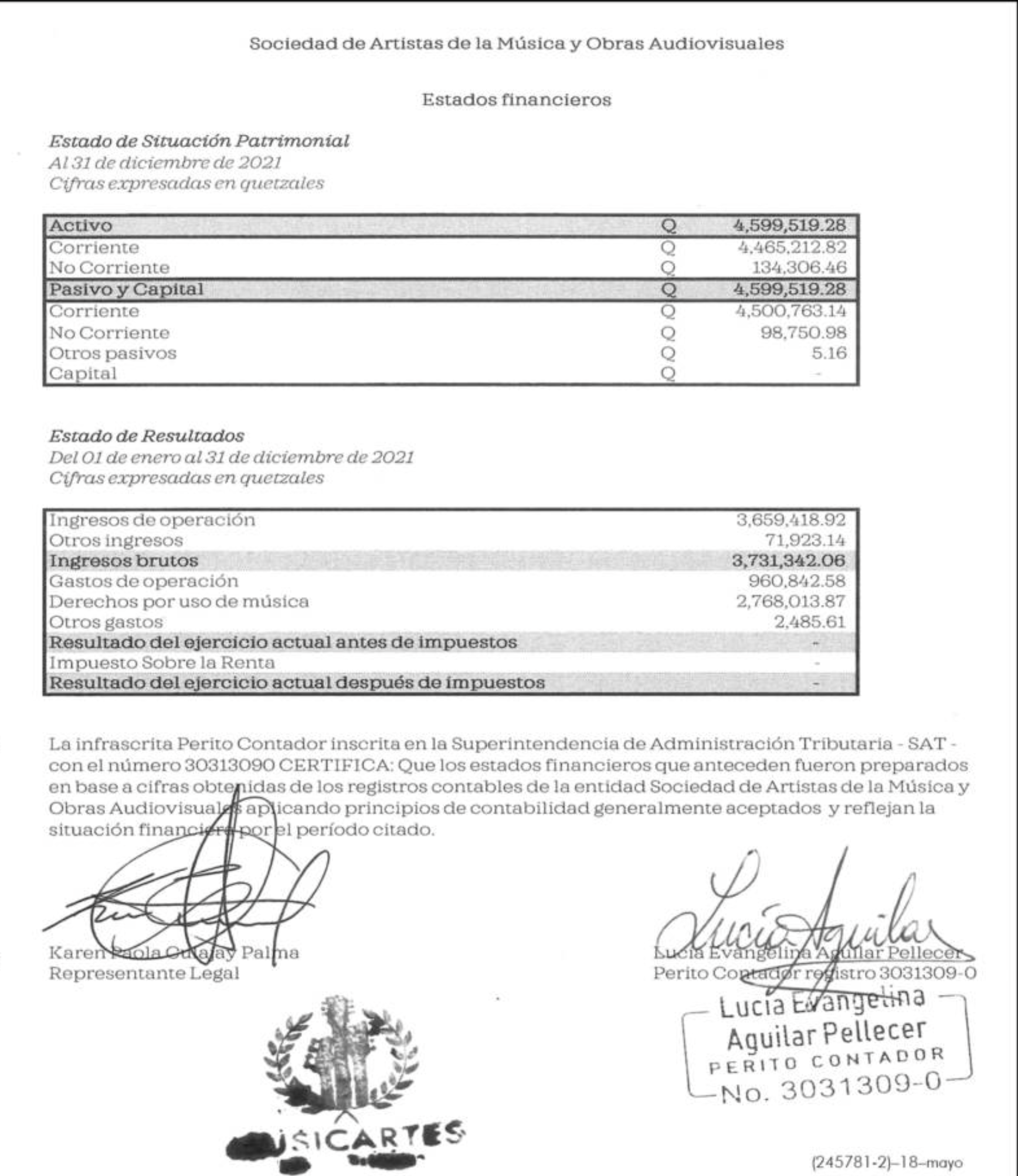 Musicartes presenta un resumen financiero detallado en cada reunión de Asamblea General para sus asociados. Se cuenta con la observancia anual del Registro de La Propiedad Intelectual y de auditorías externas a la asociación.