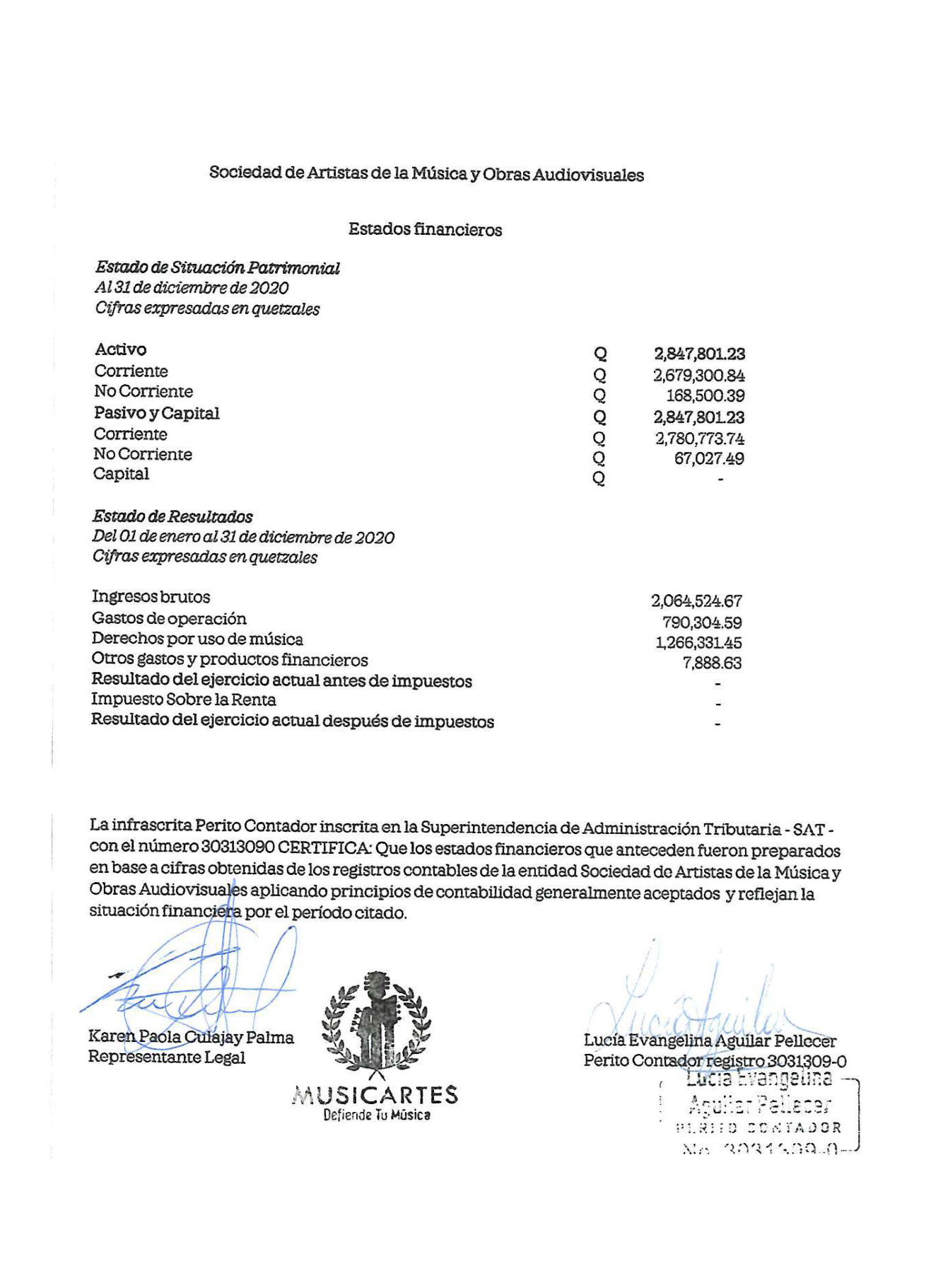 Estados Financieros de MUSICARTES – Aprobados en asamblea general celebrada durante los primeros meses del 2021.
